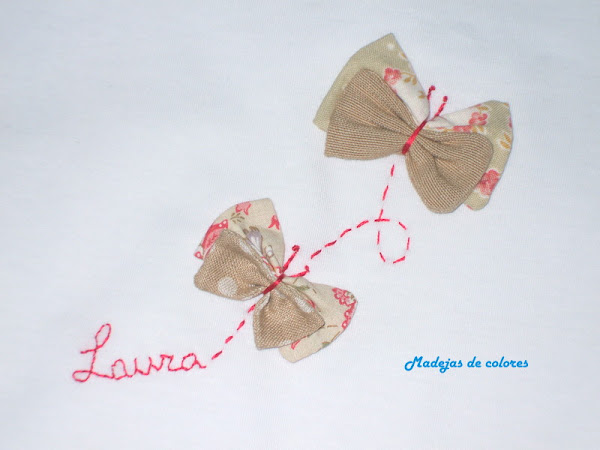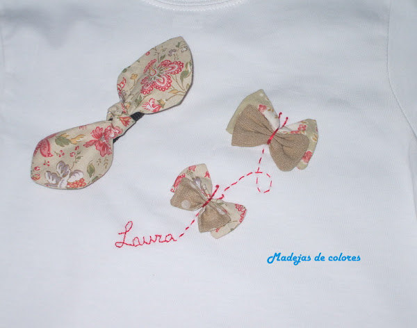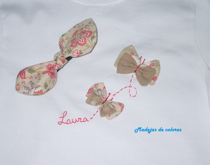 Después de que ella seleccionará las telas con las que se iban a realizar y sobre camiseta blanca, se le ocurrió que hiciera 2, es decir la madre y la pequeña detrás, dejando el rastro con su nombre bordado y a juego un coletero.
