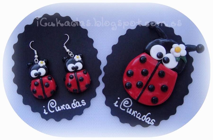 Había pensado muchas veces en hacer una mariquita, pero pensé en hacerla en fieltro, y lo iba dejando, hasta que una amiga me dijo literalmente - me podrías hacer un broche de una mariquita del material ese que usas que parece caramelo?- y dicho y hecho, fue la primera, en fimo, de esto hace siglos y he perdido la cuenta de todas las que he hecho, es una de las estrellas de iCukadas, y con el tiempo las pedían en otras cosas, como en camisetas, estuches etc, podéis ver una en fucsia aquí, aunque la original es roja.