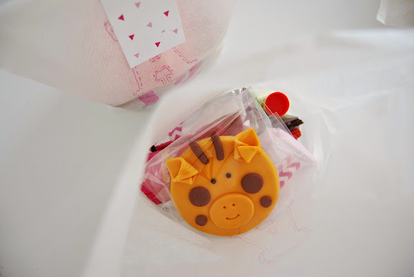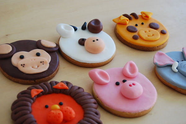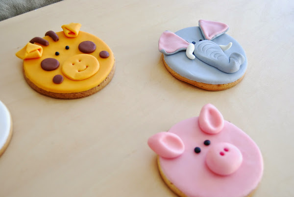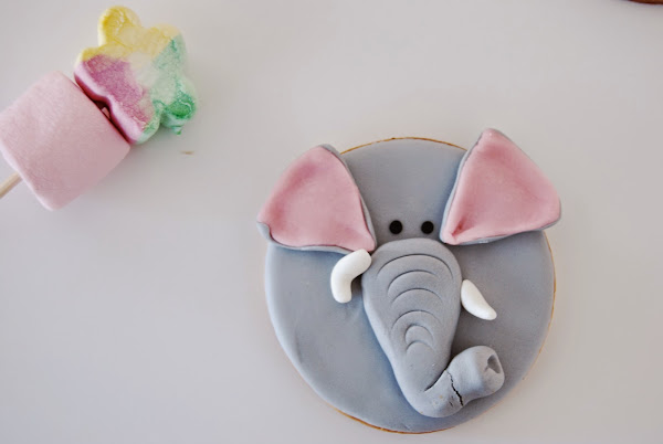 Y por supuesto mil gracias a Paula, que no quiso faltar a la fiesta de la manera que mejor sabe hacerlo (en realidad sabe hacer muchas cosas más y muy bien) : estas bonitísimas galletas de fondant que también viajaron 600 km, con sólo un pequeñísimo daño colateral en la trompa del elefante... :-).