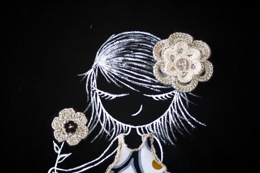 DETALLE DE APLIQUES DE CROCHETY por último, le añadí un par de flores de crochet para terminar de rematar el conjunto. La flor que lleva en la cabeza es en realidad el broche que ya enseñé en una entrada anterior. Si, ese que camuflaba la chapa de Legendario ;-). Así, cuando quiera, lo puedo usar con otra camiseta. Hay que mirar por todo...