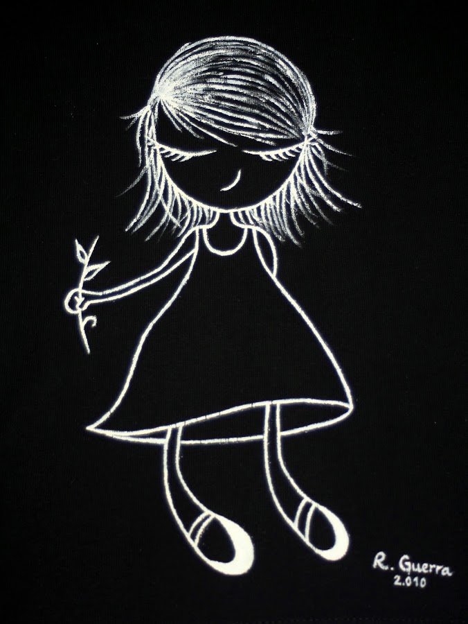 Yo decidí hacer el dibujo sobre una camiseta negra que ya tenía. Lo realicé con pintura especial para tela de color blanca. Así es tal como quedó la camiseta tras este primer paso: