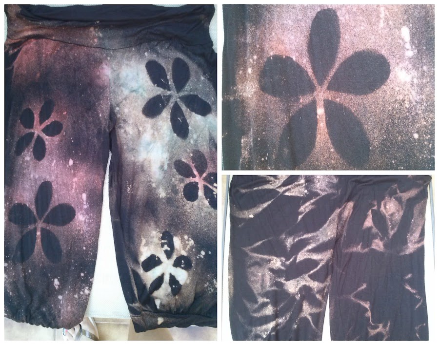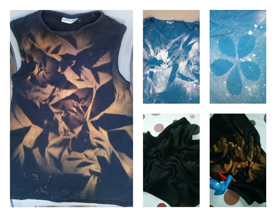 También podéis realizar algún dibujo en un plástico impermeable (los clasificadores de los blogs van muy bien), colocarlo en la prenda a teñir y dosificar la lejía. De esta manera quedará sin desteñir lo que esté bajo la plantilla. Nosotras hemos realizado unas flores, ¿os gustan?