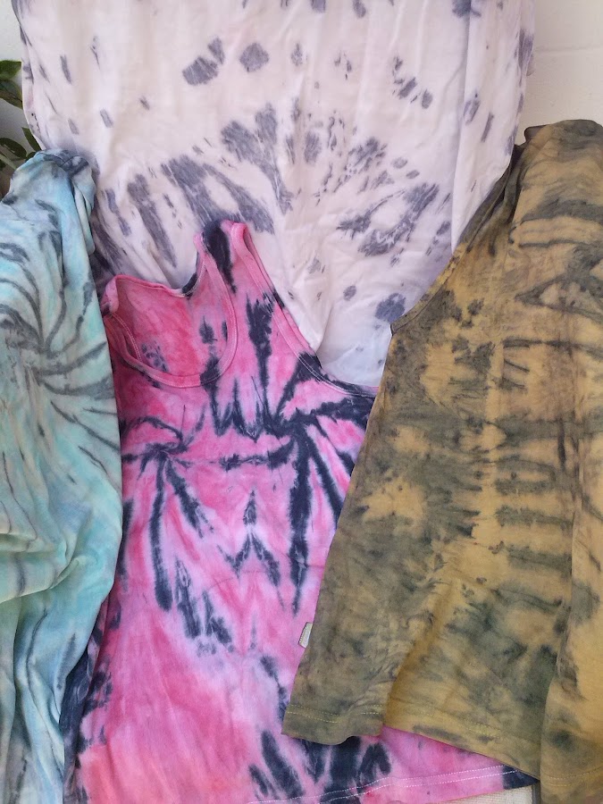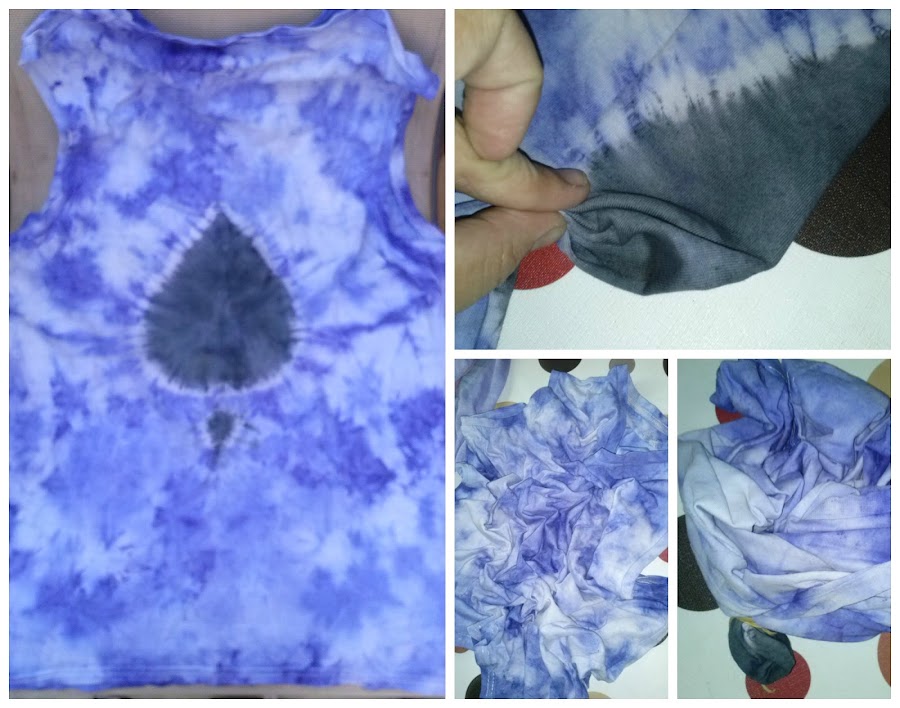 Las primeras camisetas están teñidas con el método que os enseñamos hace un tiempo, ¿os acordáis? se giran rotándolas sobre sí mismas y se tiñen haciendo triangulitos, o quesitos, cada uno de un color. Pero en este caso, para que quede el negro entre medio, lo que haremos es teñir solo de negro toda la parte de atrás del "redondo" de camiseta.