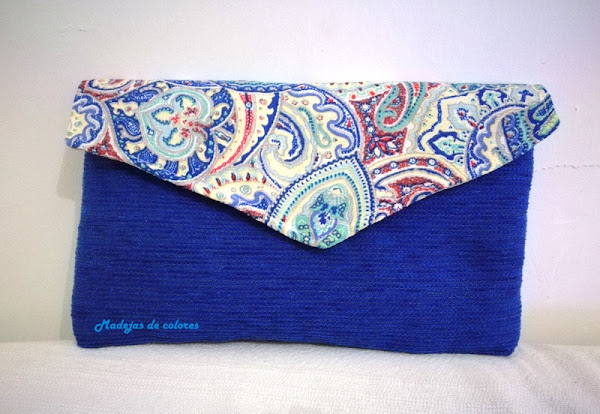 Sobre fondo azulón, tapa en pico con tela estampada cachemir en azules, verdes y rojo.