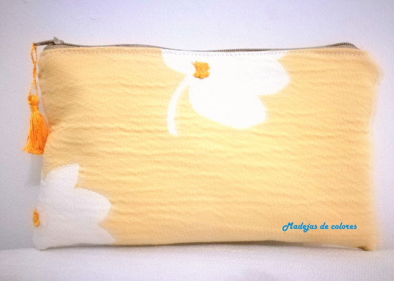 Esta con cremallera, en color caramelo claro de fondo y flores blancas con pistilos en relieve. Como adorno borlón en mismo tono.