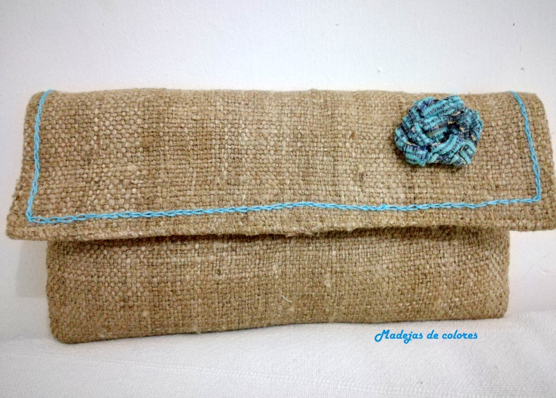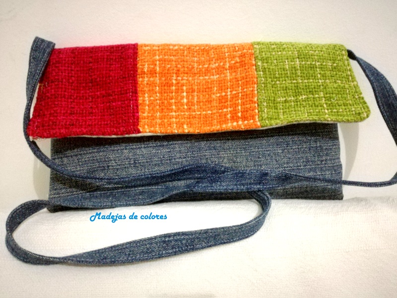 Esta es muy juvenil, con vaquero reciclado con alegres colores en la tapa. Una asa larga para llevar al hombro o de bandolera.