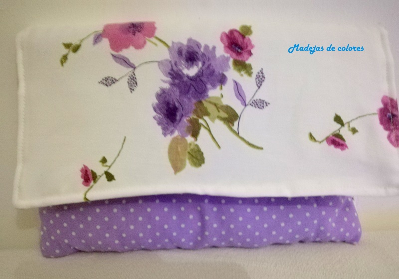 Esta es más primaveral, en la parte inferior una tela malva con topitos blancos, para que destaque la tapa superior en blanca con flores malvas y rosas.