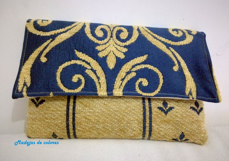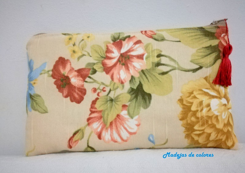 Esta tela es igual a la verde que les mostraba en anterior entrada, pero el fondo es beige. Como adorno lleva en la cremallera un borlón, coral oscuro.