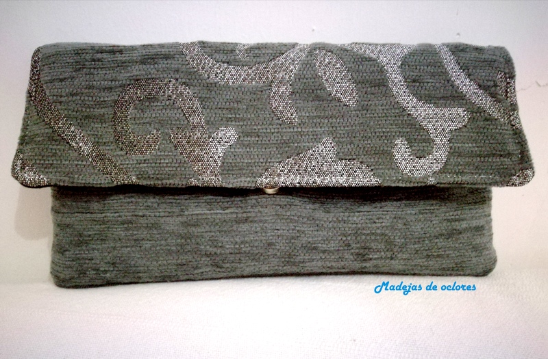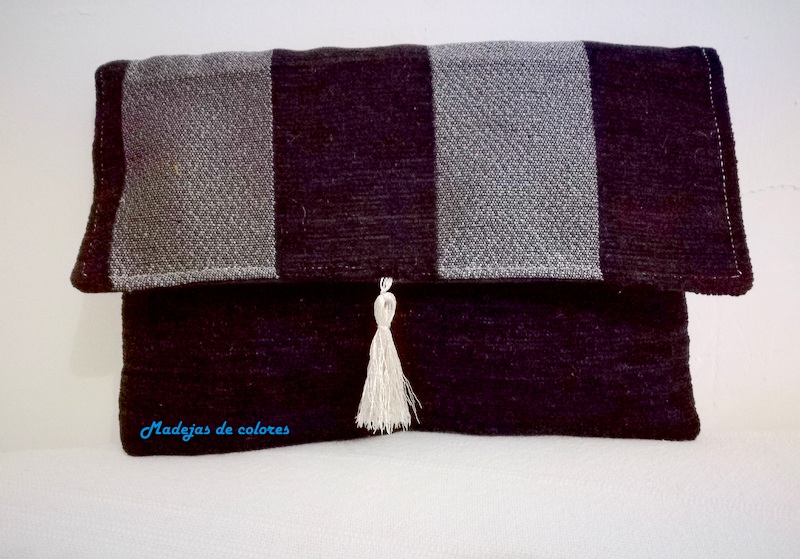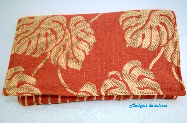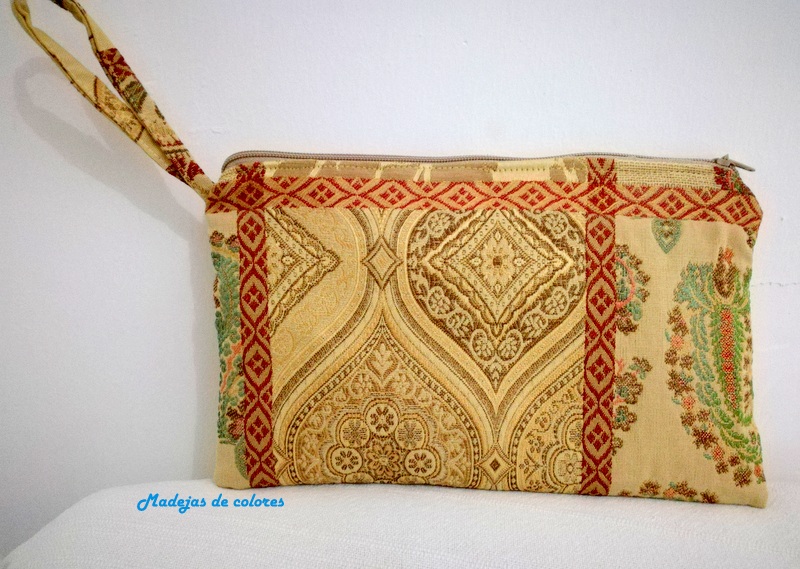 Esta tela me encanta, me recuerda al estilo hindú, con esos tonos y dibujos. Le hice un asa de mano y cierre con cremallera.