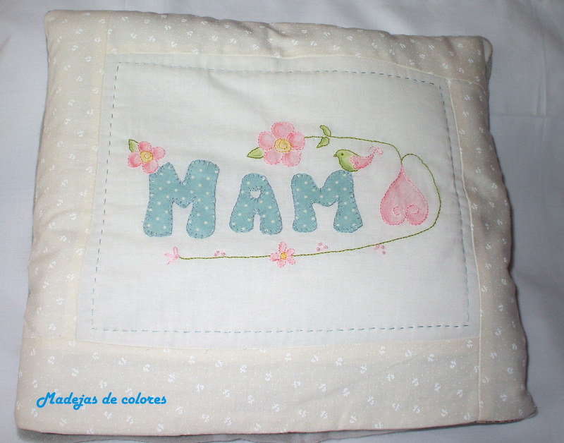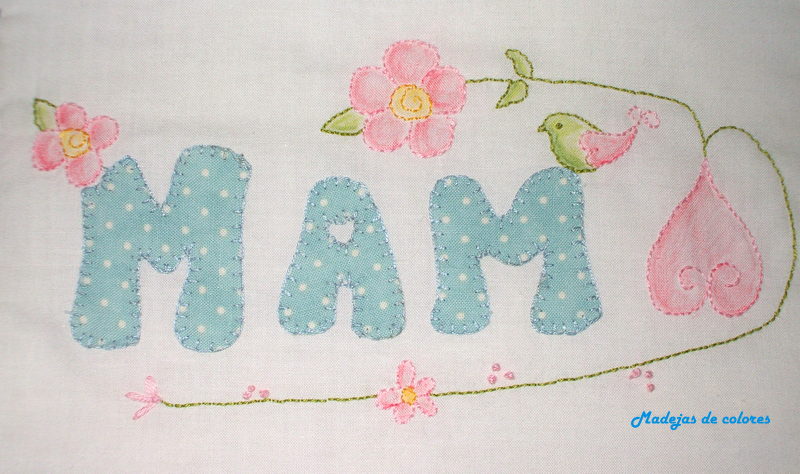 Utilicé para el enmarcado una tela hueso con unas florecitas blancas y para las letras, una tela azul con topitos blancos, formando la palabra mamá, aunque la ultima "a" la sustituí por un corazón bordado invertido..