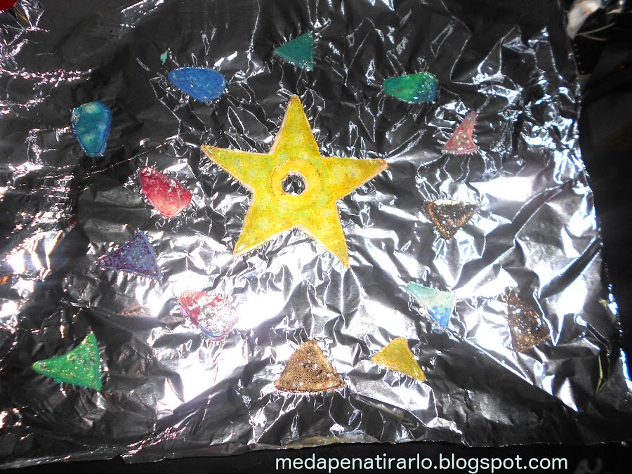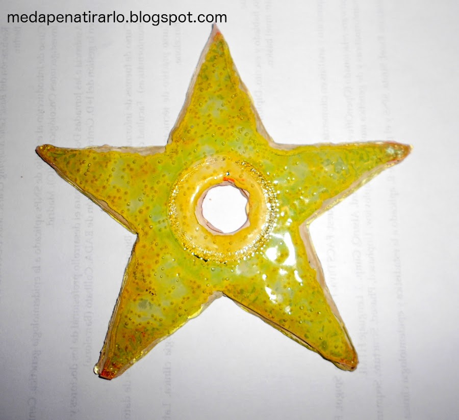 Este es el resultado. Desde luego parece más una estrella marina que una estrella del cielo. Las puntas anaranjadas dan un aspecto como de tostado, el amarillo ha perdido claridad y brillo y los goterones blancos no han contibuído a dar un toque irisado. Hay un exceso de burbujitas y se aprecia un tono verdoso. El tamaño contribuye a que se vean más los desperfectos. No la he colgado en el árbol (en su lugar coloqué una estrella de origami hecha con papel plateado reciclado de un envoltorio), pero me la guardo para cuando el próximo año en el colegio de mis hijos vuelvan a pedir adornos de Navidad hechos con material reciclado. ¡Yo ya tengo el mío hecho!