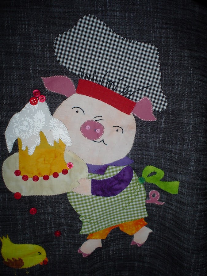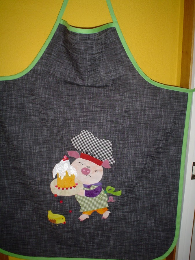y después de la cocinera tocaba el cocinero, pero un poquillo divertido, asi que cuando vi el dibujo de este cerdito ya lo vi plasmado en un delantal.