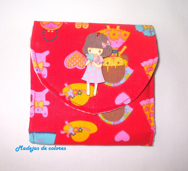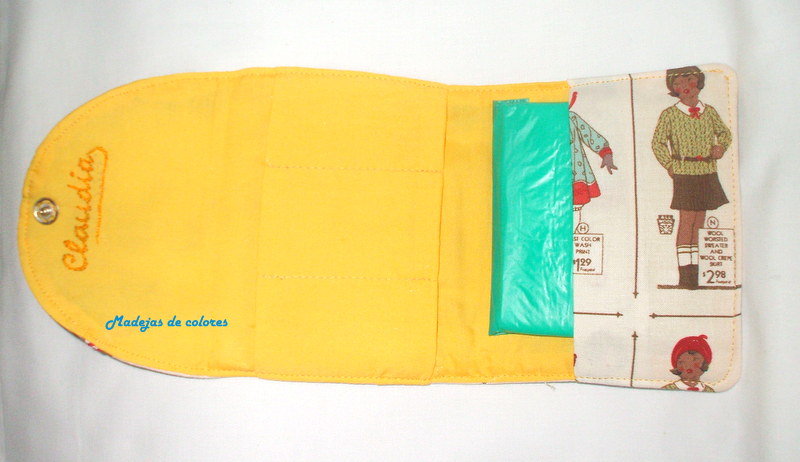 Este es para una niña primeriza. Escogí una tela alegre con muñecas. Y como adorno también el botón. Para no variar, las fotos son de pena.