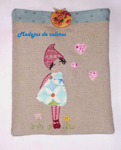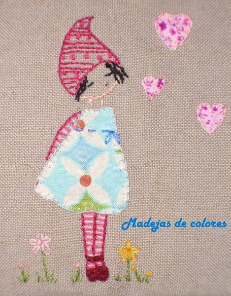 La tela de base, es la misma que en las anteriores y las aplicaciones a festón, en tonos fríos y suaves, como me pidieron. Las flores y hierba bordadas a punto tallo, margarita y nudo francés, al igual que el lazo , pelo y resto.