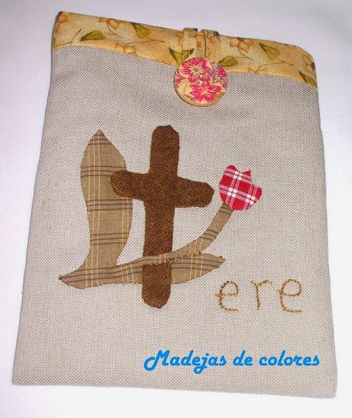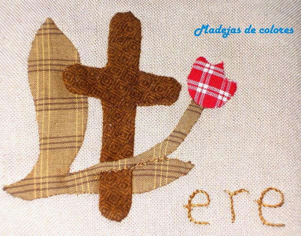 Escogí la letra de un abecedario de flores, con aplicaciones a punto escondido en tonos cálidos, como quería la clienta. El resto del nombre a punto tallo.