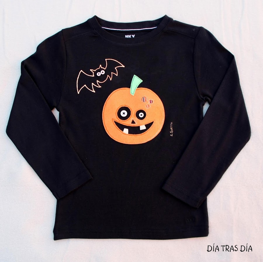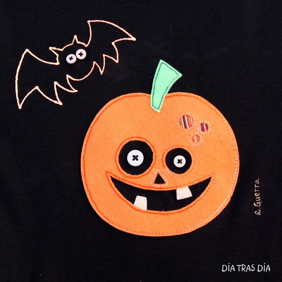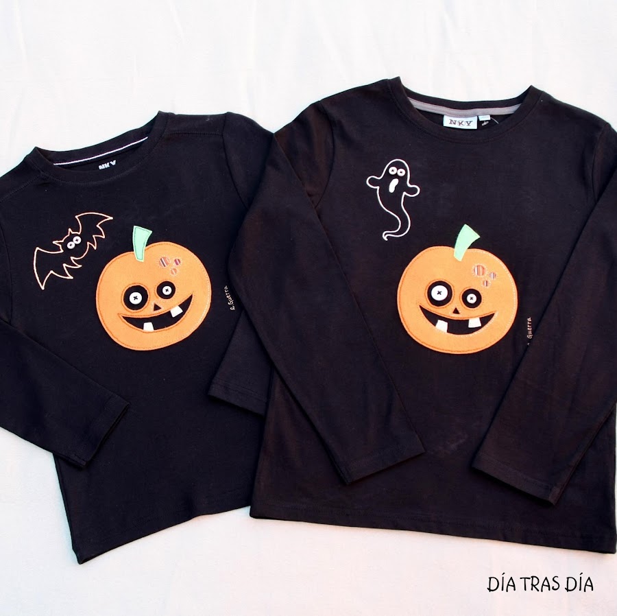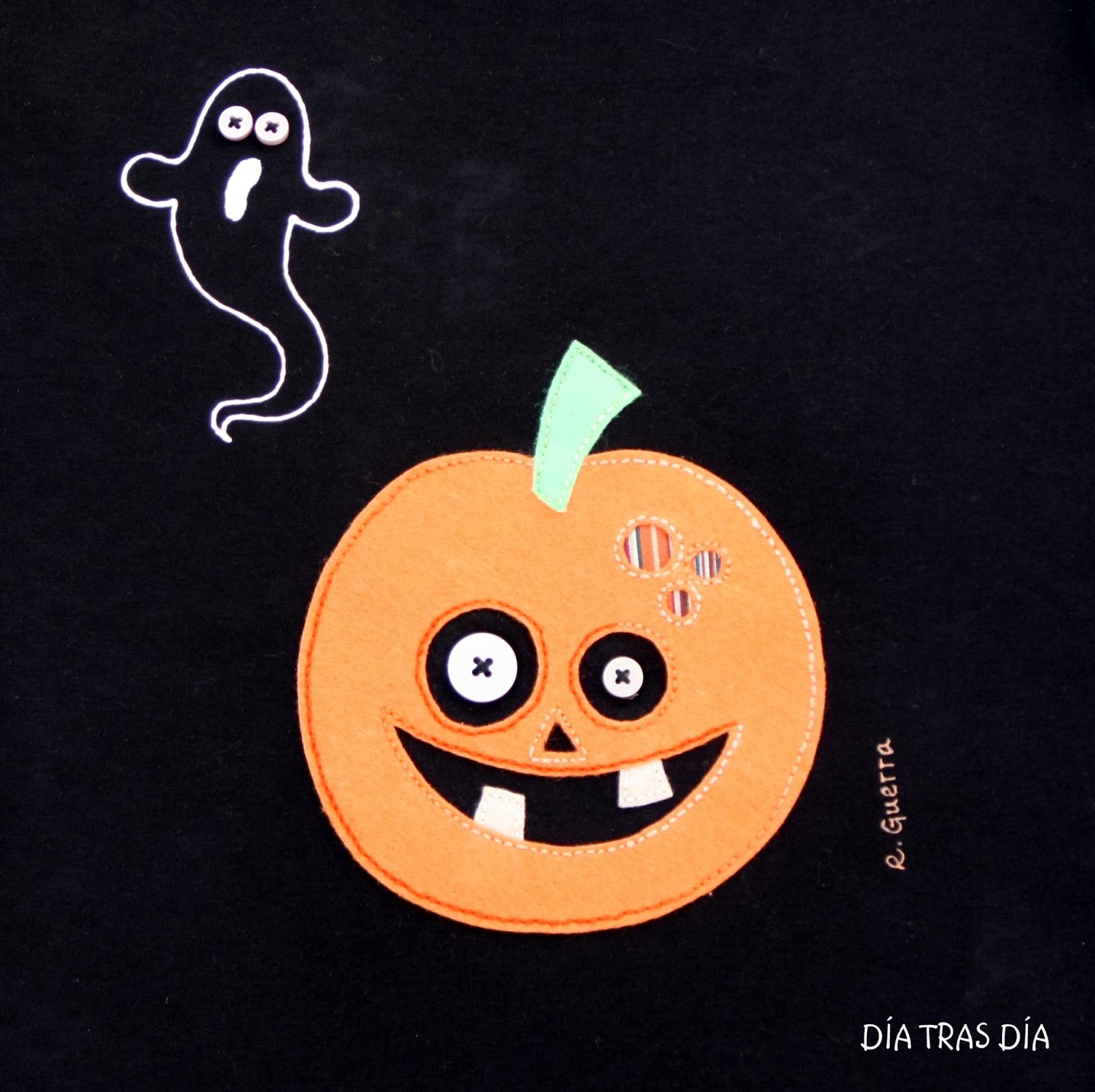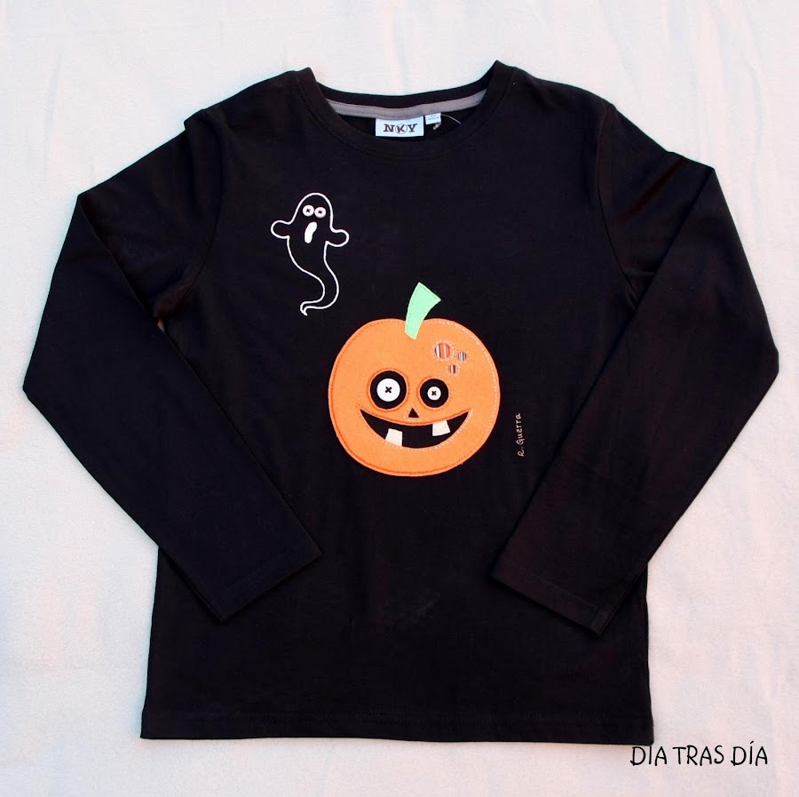La calabaza fue el punto de partida, y después ellos han elegido el complemento que querían añadirle: Abel quiso un murciélago, como la de las anteriores camisetas que hice, pero Iván prefirió que le hiciese un fantasma. Estos niños con vida propia... ;-)