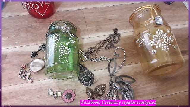 Y que tal los frascos pequeños de mermelada o mayonesa? además de darles bellos colores transparentes, fíjate que bellos lucen con esas figuras de puntos y decorados con abalorios, cadenas y falas gemas de joyería que ya no utilices, como ves, usamos lo que tenemos a mano en casa, y por sí solos son una hermosa decoración para cualquier espacio de nuestro hogar, o convertidos en porta-sahumerios, veleros, o que tal con luces?