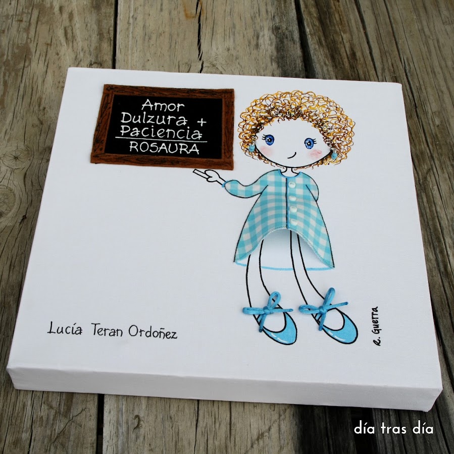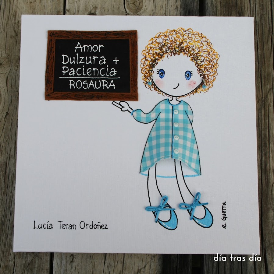 El siguiente lienzo que os enseño es el que me encargó Laura para regalar a la seño Rosaura. En esta ocasión, como tantas otras veces, Laura me envió foto de la seño con su baby de cuadritos vichy celeste. Así que rebusqué entre mis retales hasta que localicé uno que le venía a la perfección.