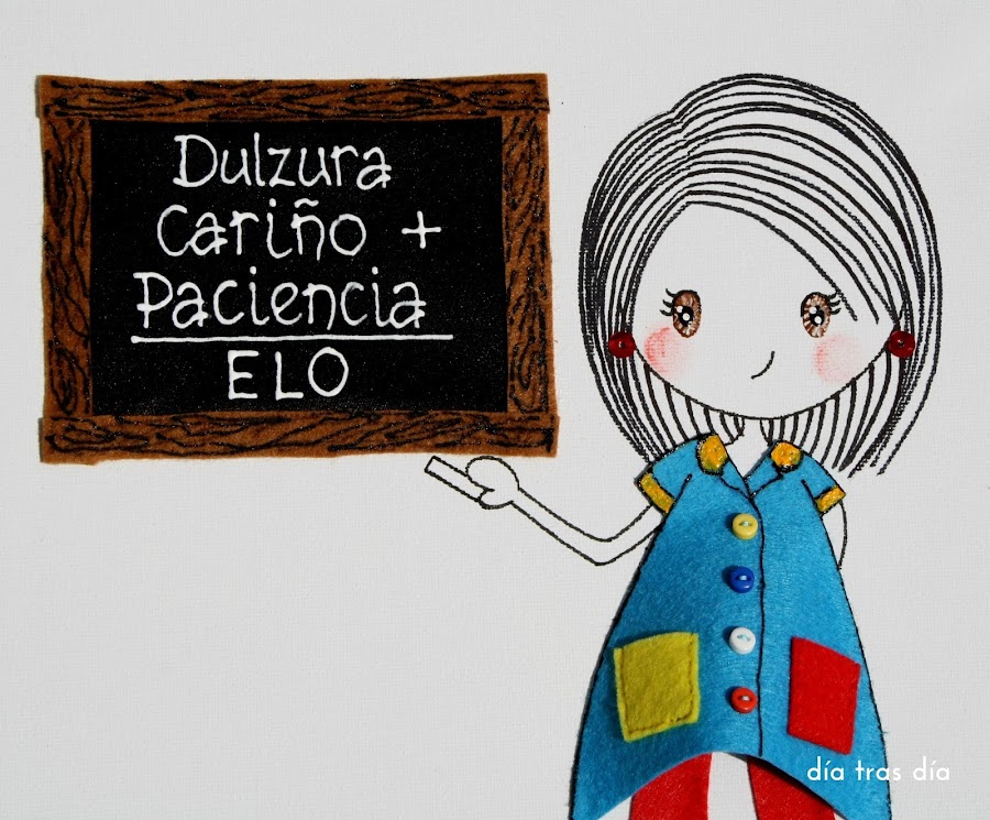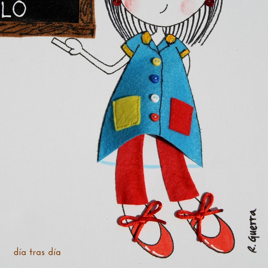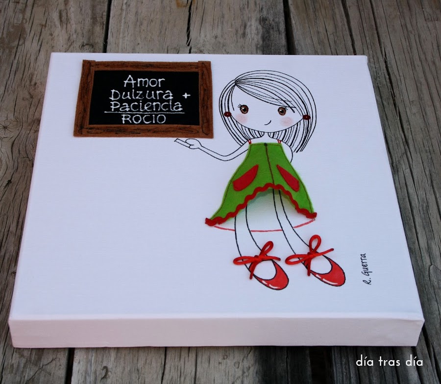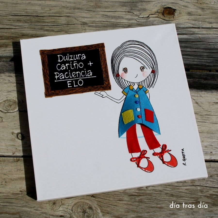 Y por último, este fue el lienzo que me encargó Vanesa para regalar a la seño Elo. Vanesa me mandó una foto para qye viese cómo es el uniforme que lleva la seño, que va ataviada con un uniforme muy colorido, compuesto por blusa y pantalón.