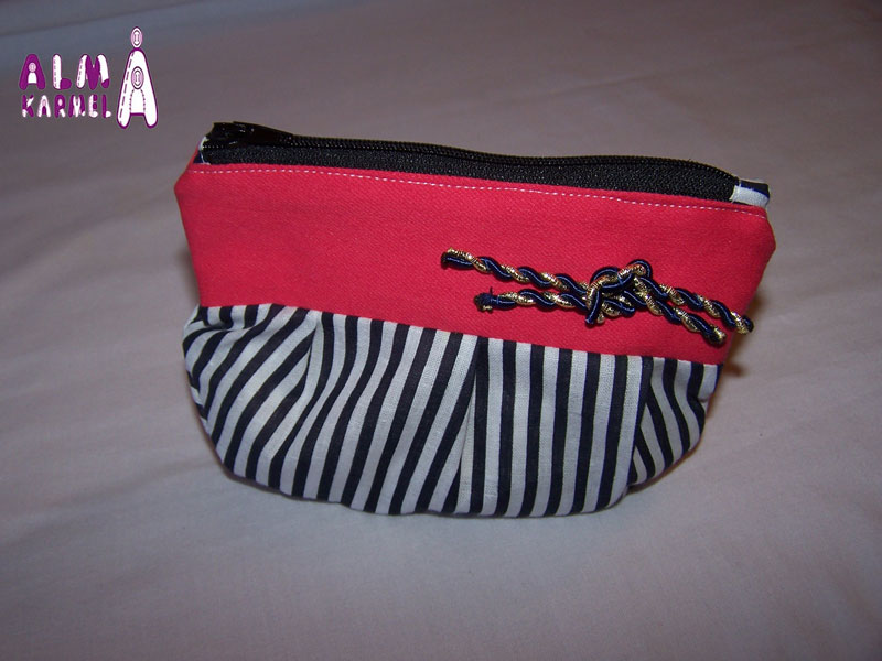 De estilo marinero, en rayas negras y blancas y rojo, y con un nudo marinero de adorno.