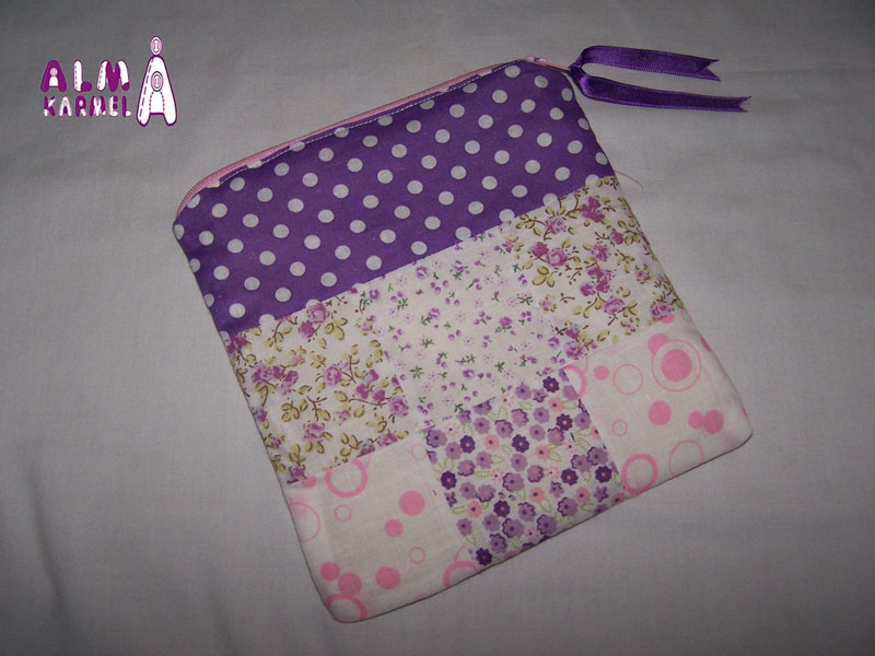 Este más cuadrado, con diferentes telas en tonos morados, tipo patchwork, y una cinta morada adornando la vcremallera.