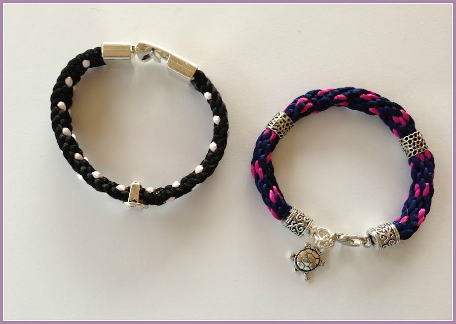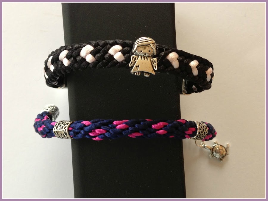 Estas dos pulseras quedan también muy bien. La negra está hecha siguiendo el tutorial que os mostré en esta otra entrada. El color de los corazones, aunque no se aprecia en las fotos, es un color rosa perla muy bonito. Como adorno lleva una muñequita separador.