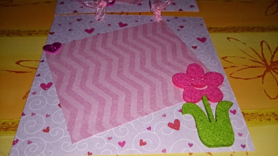 Para Irene hice un miniábum desplegable tipo cuadritos para colocar sobre una pared como decoración de la habitación de la niña. Es un tipo de álbum diferente realizado con papel scrap de doble cara estampado con corazones y cuadrados y cinta de raso. La composición quedó muy dulce, tal y como es Irene.