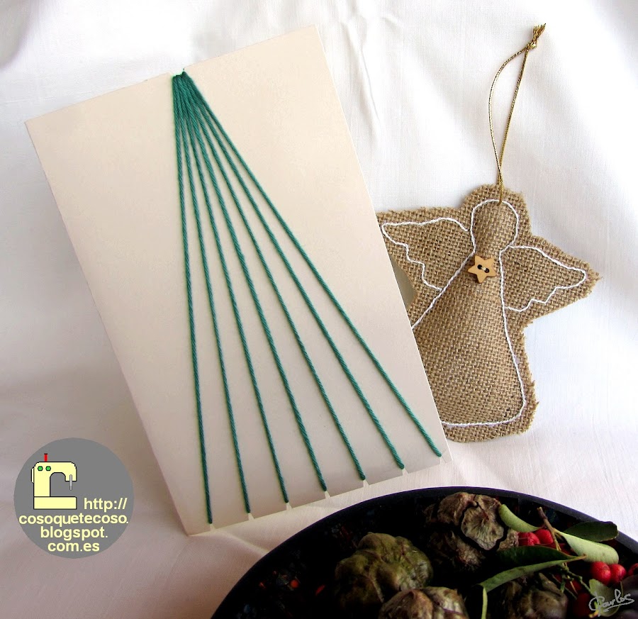 Enseguida he visto el angelito de arpillera bordado a mano en punto de tallo. No se puede tener mejor detalle: el material que más uso y el punto que más bordo. Por cierto, genial hecho.