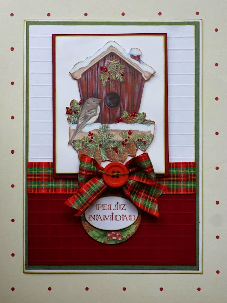La tarjeta de las velas es una versión navideña de la que hice para mi hija Inés por su cumpleaños. Y la de la casita de pájaros tiene una imagen que me encanta, y que he repetido varias veces ya. El año pasado fue la protagonista de la tarjeta para Dolors. Las cartulinas roja y blanca de fondo tienen un embosado hecho con la Scor Pal.