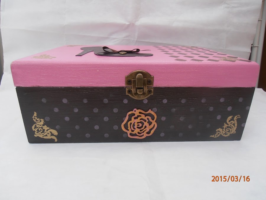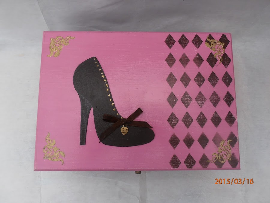 La idea de este joyero la vi en un blog brasileño que ahora no recuerdo su nombre pero en cuanto lo encuentro os lo pongo pues hace mucha mezcla de sellos y texturas junto al decoupage, la plantilla del zapato lo puso la misma chica, yo la hice en cartulina