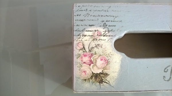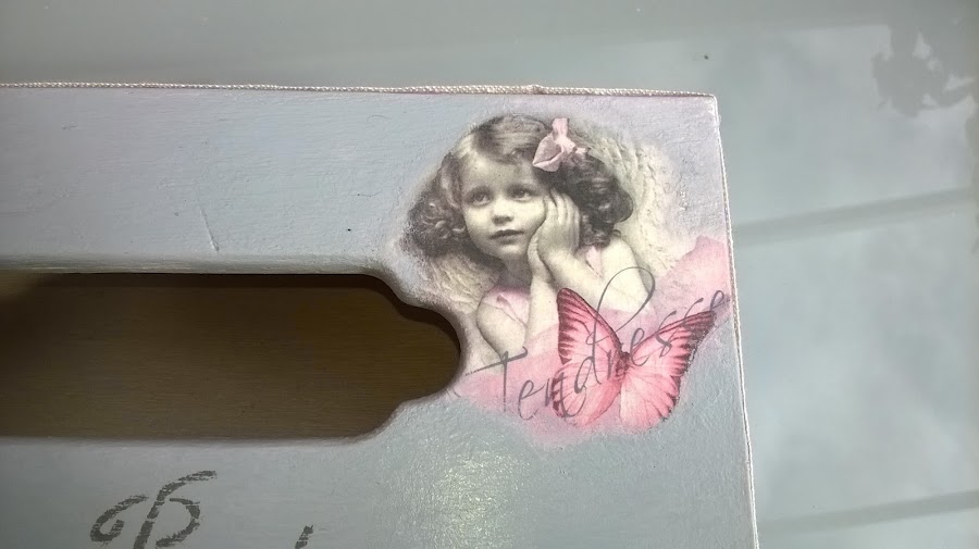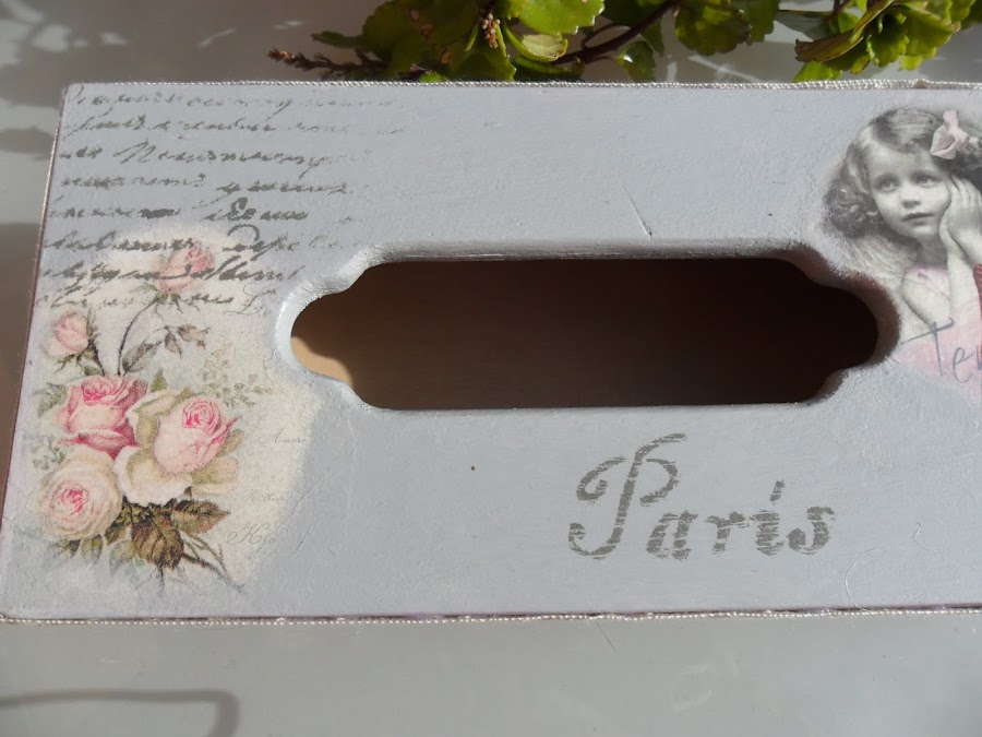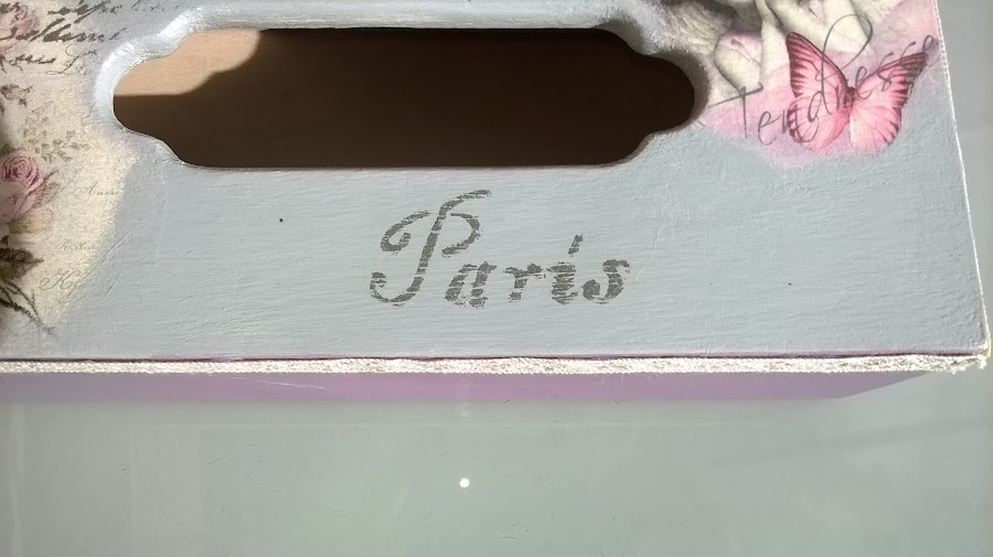 La parte de arriba la pinté en un color grisáceo que ya tenía y le puse en una esquina un trocito de servilleta (la de las flores) y en la otra esquina la imagen de la niña vintage es de papel arroz. Intenté integrar las imágenes lo mejor posible, en la parte de arriba de las flores le hice un estarcido de letras y en la parte de abajo la palabra París y desgasté un poco los dos estarcidos.