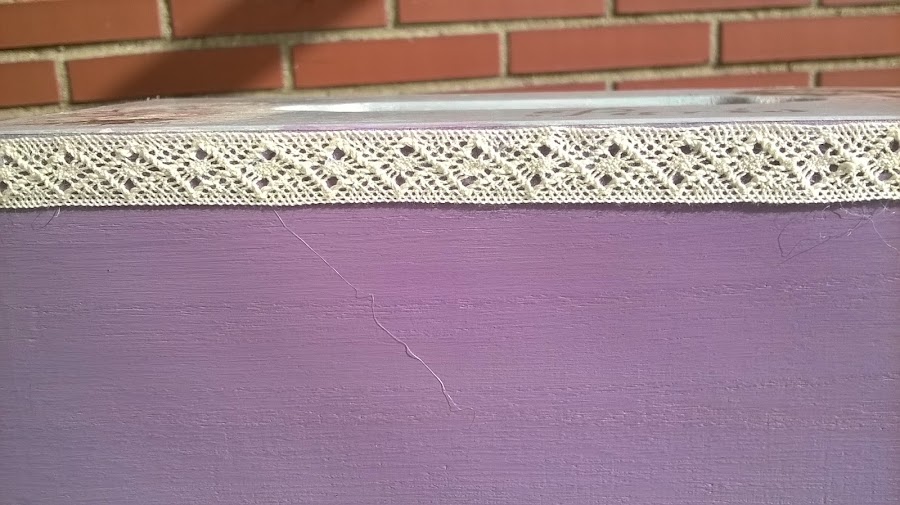 La parte de abajo la pinté con un color chalky de americana que compré cuando estuve en Creativa, me encanta este color. Para el borde de la parte de arriba le puse este puntilla que tenía.