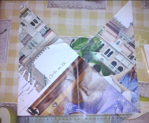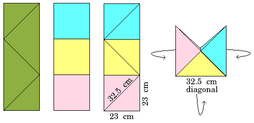 Mientras trataba de armar el patrón en papel con las medidas anteriores, me costaba trabajo lograr la simetría en los dobleces, entonces forme el largo del rectángulo con 3 cuadrados y voilà... además de simetría pude visualizar una bolsa hecha con 3 cuadrados independientes, solo que la abertura resulta mas ancha. Gracias a esta fase obtuve las medidas de mi posible bolsa a cuadros, con 23 cm de lado cada cuadro, para dar un rectángulo de 23 cm x 69 cm de largo. (También podrían ser cuadrados de 20 cm, pero quiero una bolsa un poco mas grande).