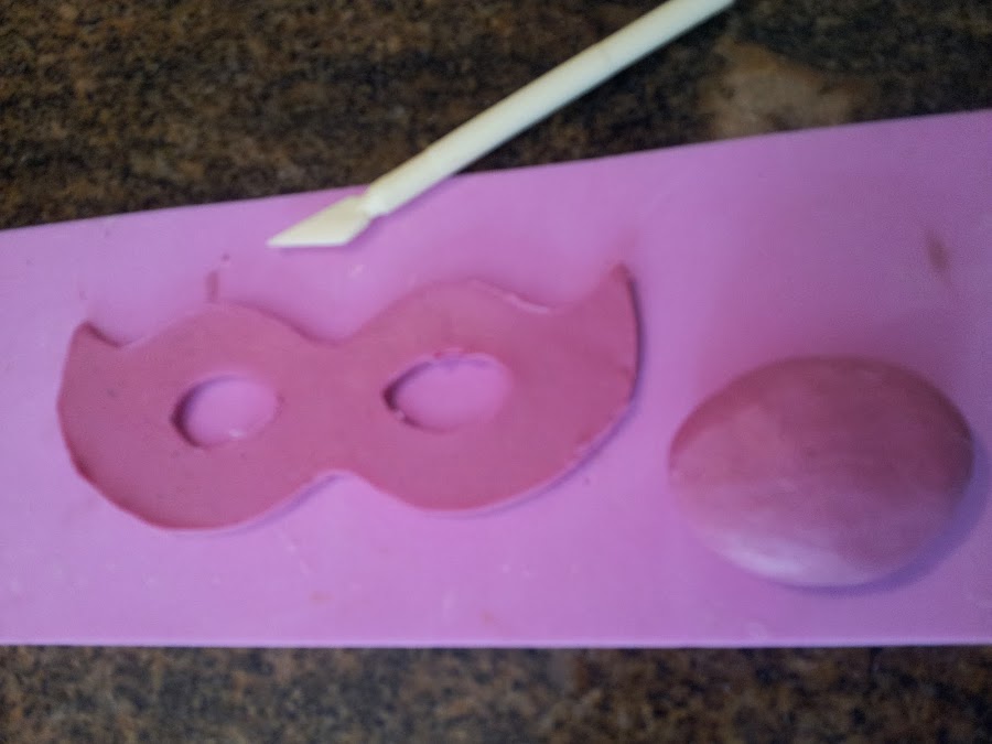 1) Estiramos con rodillo, masa teñida de cualquier color, cortamos con un cortador con forma de mascara o con un patrón o molde.
