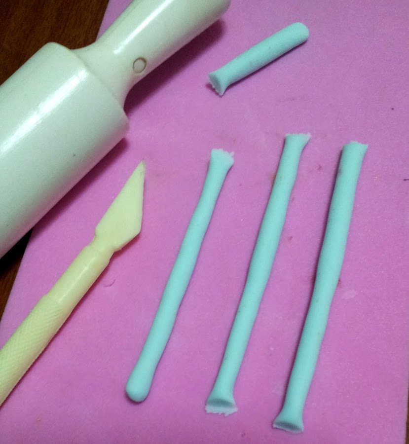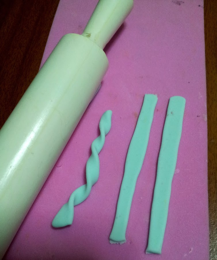 3) Realizamos unos rollitos de masa teñida con los colores azul turquesa y violeta o morado. Los aplanamos y enrollamos.