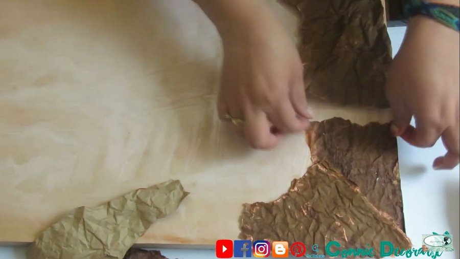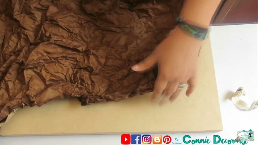 pegaremos pedazos de papel de pesebre sobre la tabla, los cuales pintaremos por el borde, como se muestra en el vídeo
