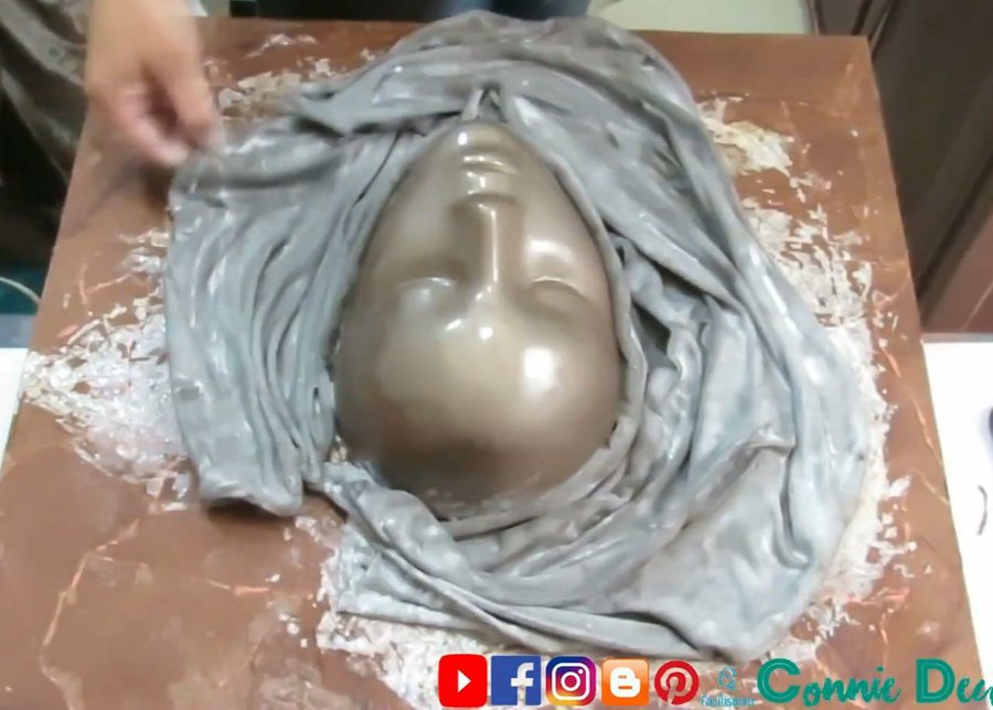 Colocaremos la tela alrededor de la cara dándole forma, como se muestra en el vídeo.
