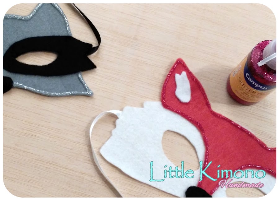3. Cortamos dos trozos de cinta de raso y pegamos un trozo a cada lado de la máscara por la parte de atrás. Y Finalmente decoramos con pegamento Glitter de colores...