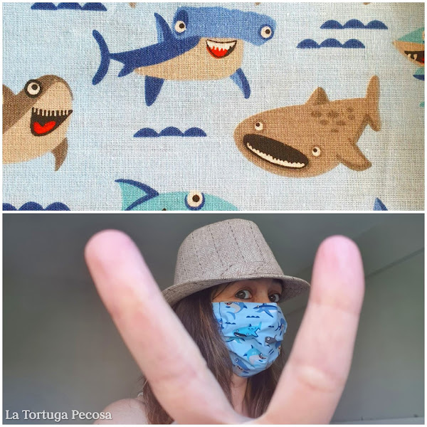 Feliz martes. Hoy os traigo esta mascarilla color azul clarito con tiburones, 100% algodón, tipo acordeón, con adaptador de nariz y con filtro tnt para luego cambiar.