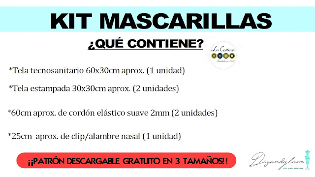 Para hacer ambas mascarillas he utilizado un kit de Mercería La Costura. El kit trae todo lo necesario para hacer 2 mascarillas. Aquí puedes ver todo lo que trae
