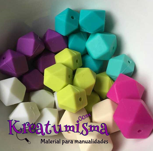 - Bolas y figuras de silicona: Puedes alternar en tamaños entre los 12mm - 15mm. También existen bolas irregulares, hexágonos de silicona y varias formas más...