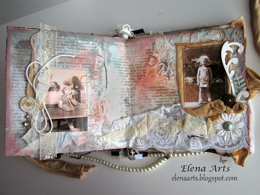 O crear el fondo con un papel de periódico como en este álbum. I además, seguro que todos encontraremos encajes, botones, piedras y piezas rotas de un collar, cordones, hilo, cualquier furnitura de costura, etc. Y si no, preguntad a vuestras abuelas jeje
