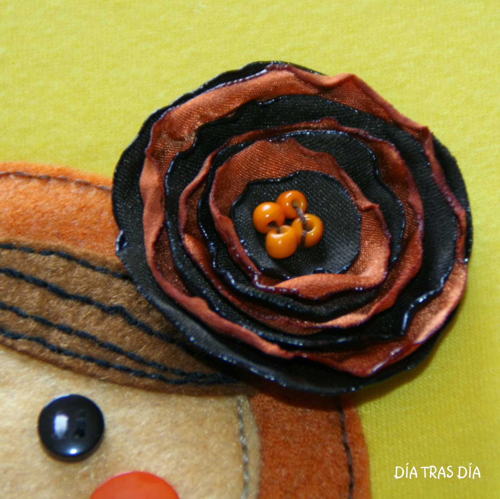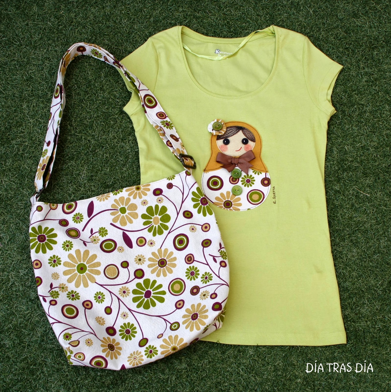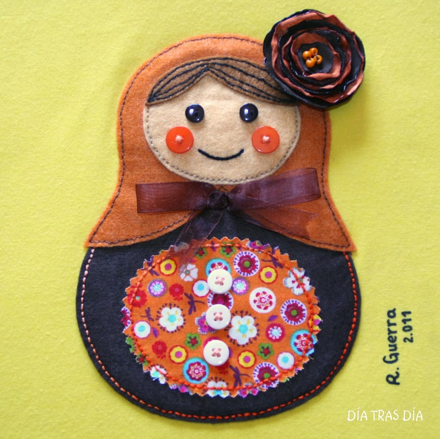 Decidí entonces hacerle una nueva Matrioska, empleando la misma tela del bolso y colores a juego con esos tonos. Y por supuesto, también esta vez sin flor de crochet ;-).