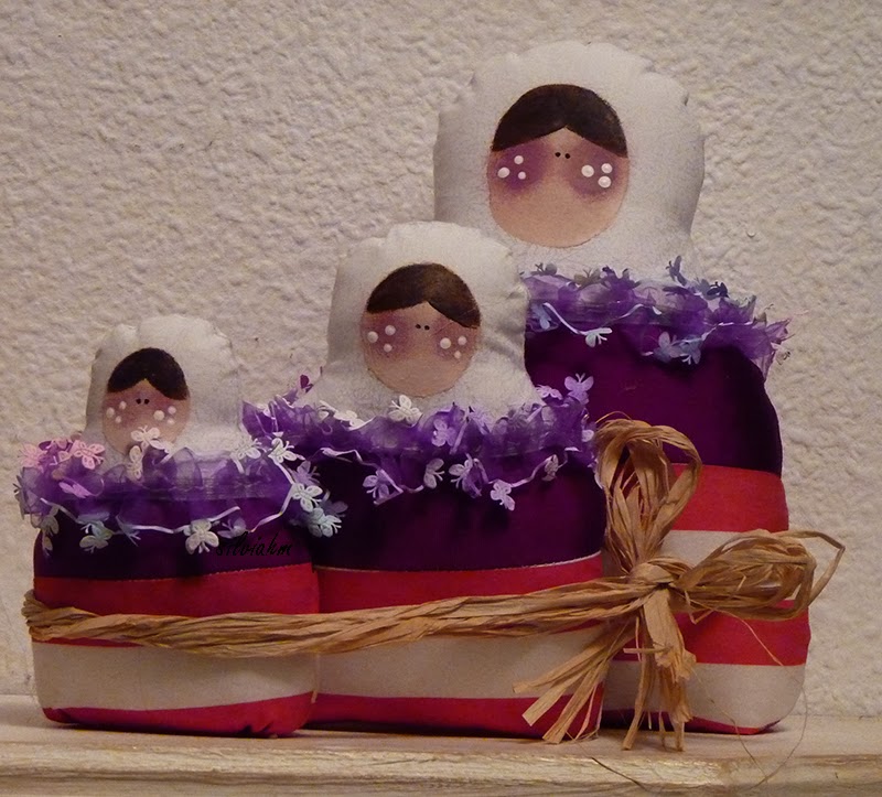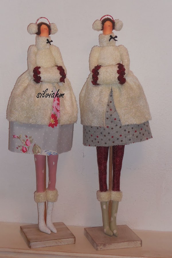 Estas son las últimas matriuskas y tildas que he hecho esta semana.Creo que estas dos "invernales" son el modelo que más me gusta, aunque también son las que más trabajo dan , ya que trabajar con borreguillo en esos brazos tan estrechos cuesta bastante, pero el resultado merece la pena.