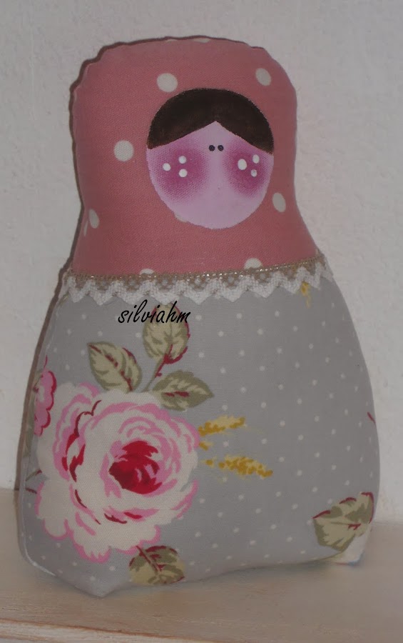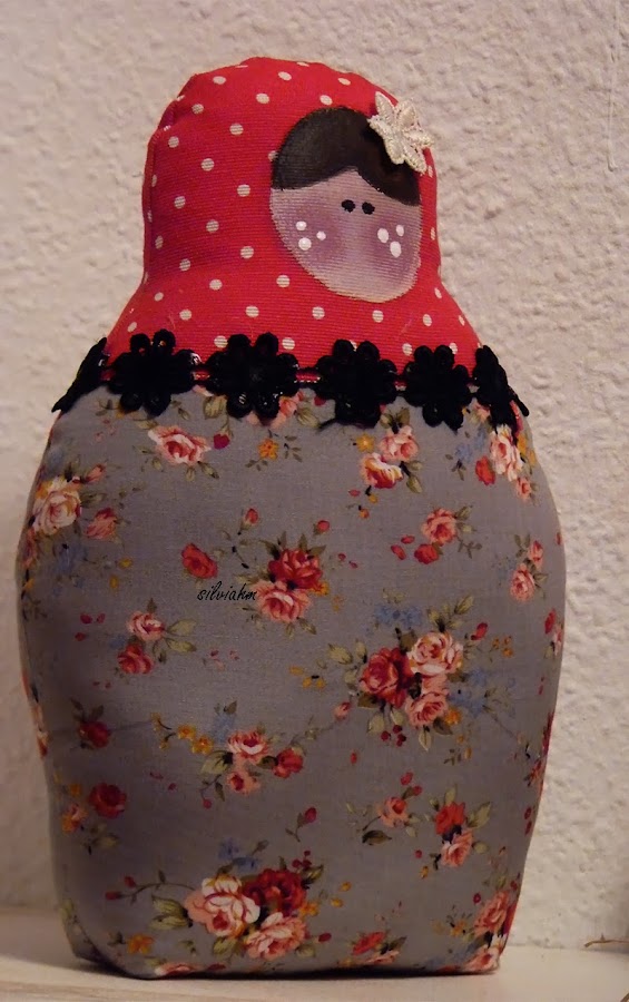 Y esta matriuska grande es un tope de puerta para una habitación infantil, mide 38 cm. y se tiene perfectamente de pie. La otra que véis también tiene base y es un poco más pequeña.Y este grupo de tres también irá destinado a sujetar una puerta¿Habéis visto la cinta con mariposas?