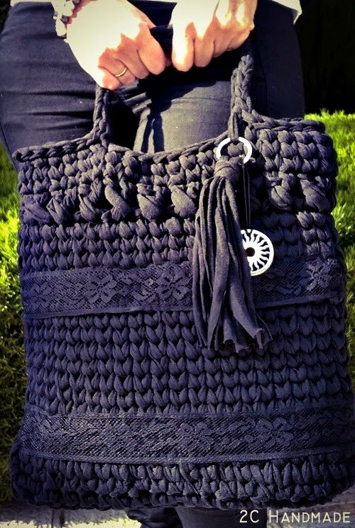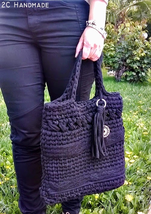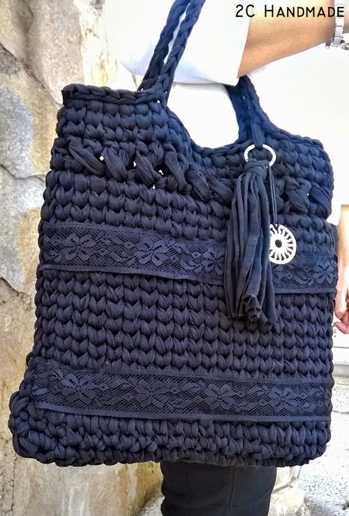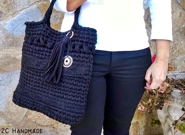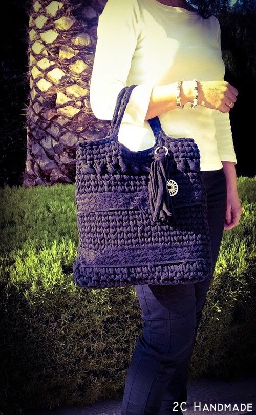 Yo, que soy una enamorada de los bolsos, que me gustan de todas las formas y tamaños, no podía dejar de pensar que tenía que hacer uno grande, hasta que un día me vino la inspiración y mis manos volaron con el ganchillo y me guiaron hasta este diseño. Está tejido con un trapillo muy ligero, por lo que no pesa demasiado.