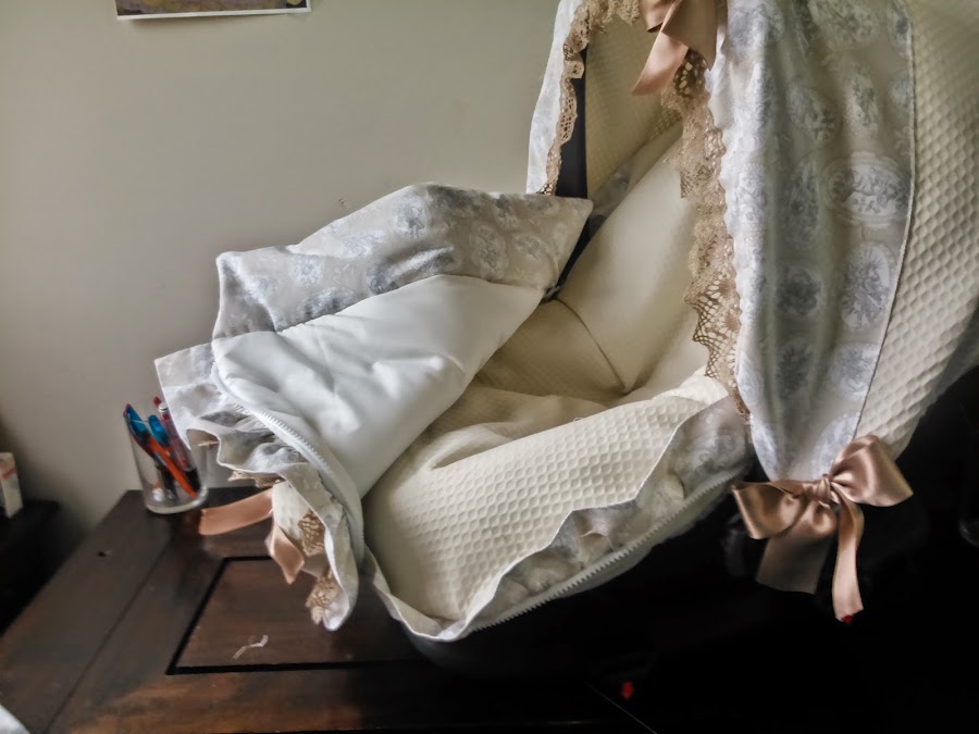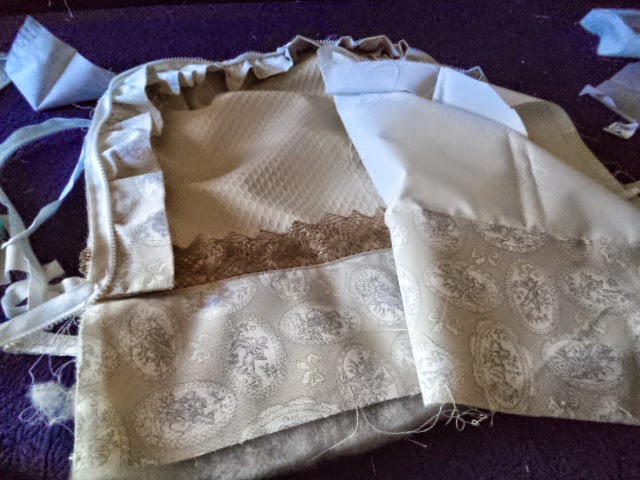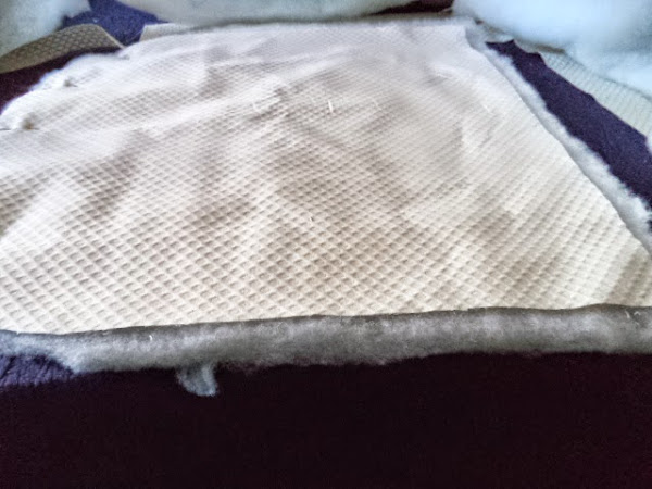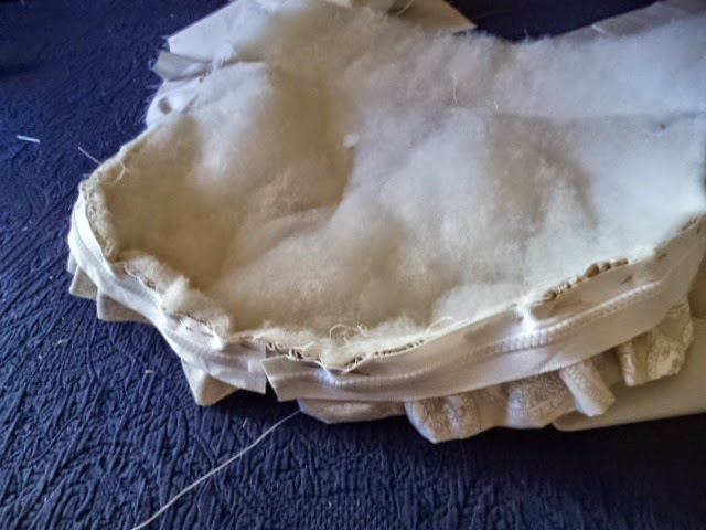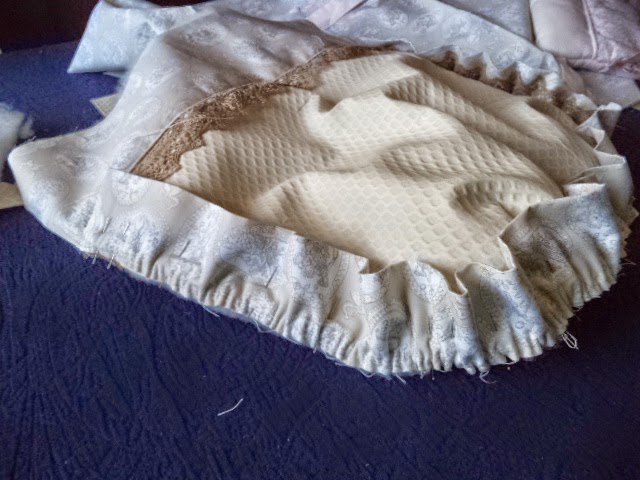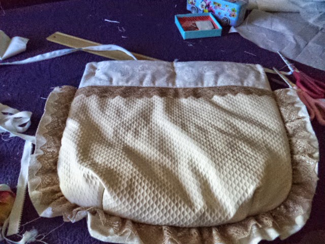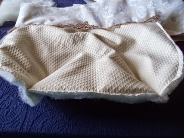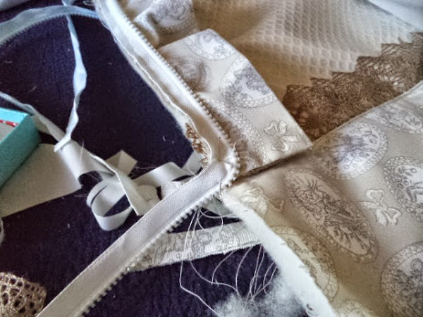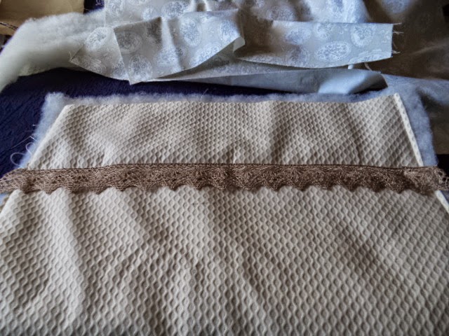 en la tela junto con la guata colocamos el esbozo con la tela de contraste...puntilla....zig...lo que queramos poner