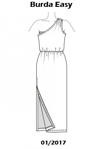 La falda es un rectángulo, más sencillo imposible. A partir de aquí, podemos añadirle la parte de arriba como más nos guste y tener así diferentes vestidos. Por ejemplo, otro rectángulo y tener un vestido palabra de honor, un top con cuello halter o un top con un hombro al aire como es este caso.
