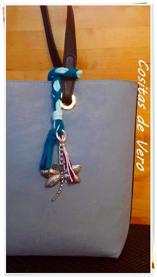 Yo los he hecho con trapillo y con colores que van con el bolso. En uno he hecho una trenza y en el otro he ido cruzando el trapillo turquesa sobre el clarito haciendo rombos. En el de rombos (mariposa) he procurado hacer un aro en ambos extremo para poder enganchar el llavero en uno de ellos y en el otro decorarlo con los abalorios.