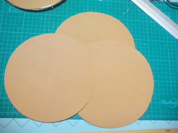 1. Cortamos varios cartones de 25 cm de diámetro y forramos con goma Eva, en mi caso marrón clarito.